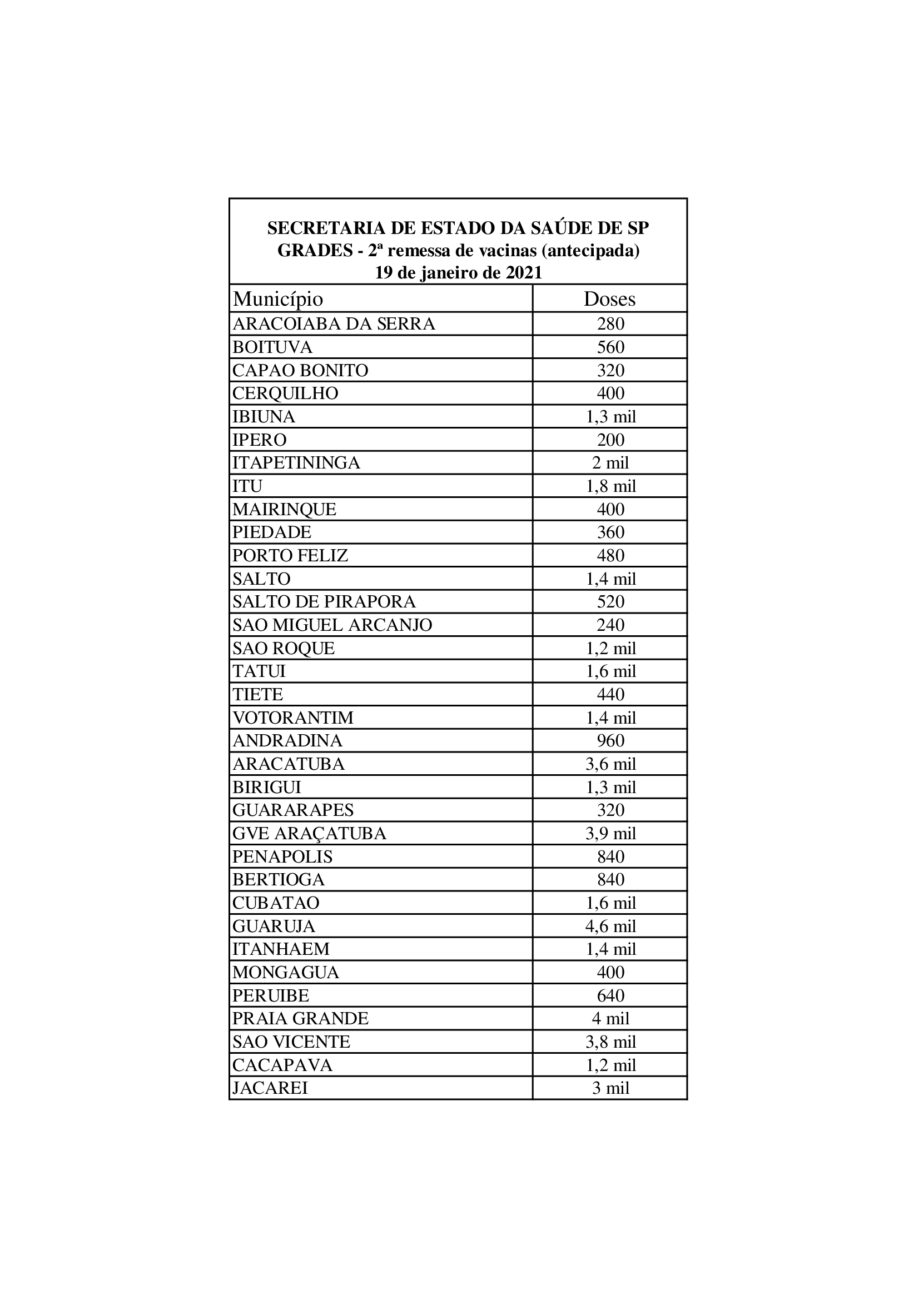Durante o dia de hoje (19), outras 305 mil doses já tinham saído nas primeiras grades para 28 locais das regiões da Grande São Paulo, Sorocaba e Vale do Paraíba. As remessas foram direcionadas diretamente a 26 Prefeituras de cidades com mais de 30 mil habitantes e a outros dois Grupos de Vigilância Epidemiológica (GVE) regionais que farão a subdivisão para cidades menores em suas áreas de atuação (mais informações em https://bityli.com/UJcO1 ).